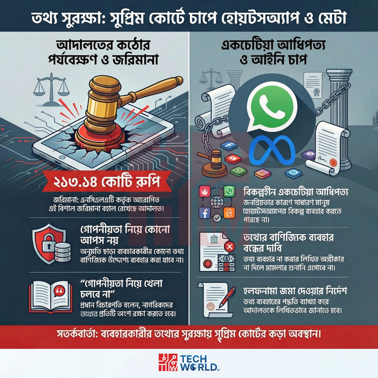 ভারতের সুপ্রিম কোর্ট ব্যবহারকারীর তথ্য বাণিজ্যিকভাবে ব্যবহারের বিষয়ে হোয়াটসঅ্যাপ ও মেটা প্ল্যাটফর্মকে সতর্কবার্তা দিয়েছে । আদালত বলেছে, ভারতের নাগরিকদের গোপনীয়তা নিয়ে খেলা করা চলবে না এবং ব্যবহারকারীর একটি তথ্যও অনুমতি ছাড়া শেয়ার করা যাবে না।